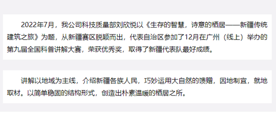 全國科普講解大賽是我國范圍最大、水平最高、代表性最強、最具權(quán)威性的科普講解比賽,至今已成功舉辦9屆。新疆建筑設(shè)計研究院有限公司,作為新疆城鄉(xiāng)建設(shè)發(fā)展的主力軍,這是第一次參加此類比賽。今后將繼續(xù)以科普推廣的實際行動,展現(xiàn)建筑設(shè)計工作者的責(zé)任與擔當,共同建設(shè)團結(jié)和諧、繁榮富裕、文明進步、安居樂業(yè)、生態(tài)良好的美好新疆。